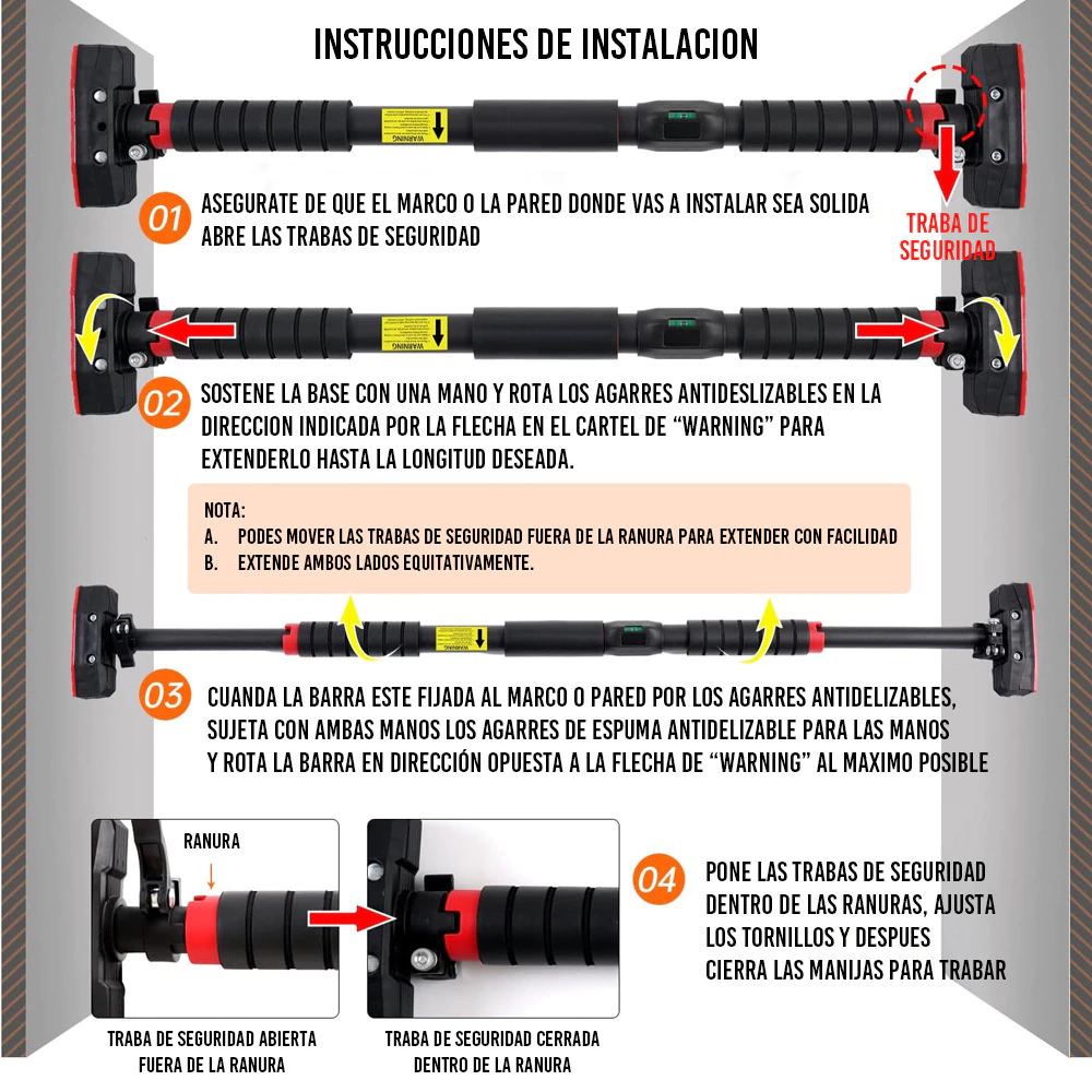 Su diseño permite que la barra se sujete de manera segura al marco de la puerta, sin dañarlo.